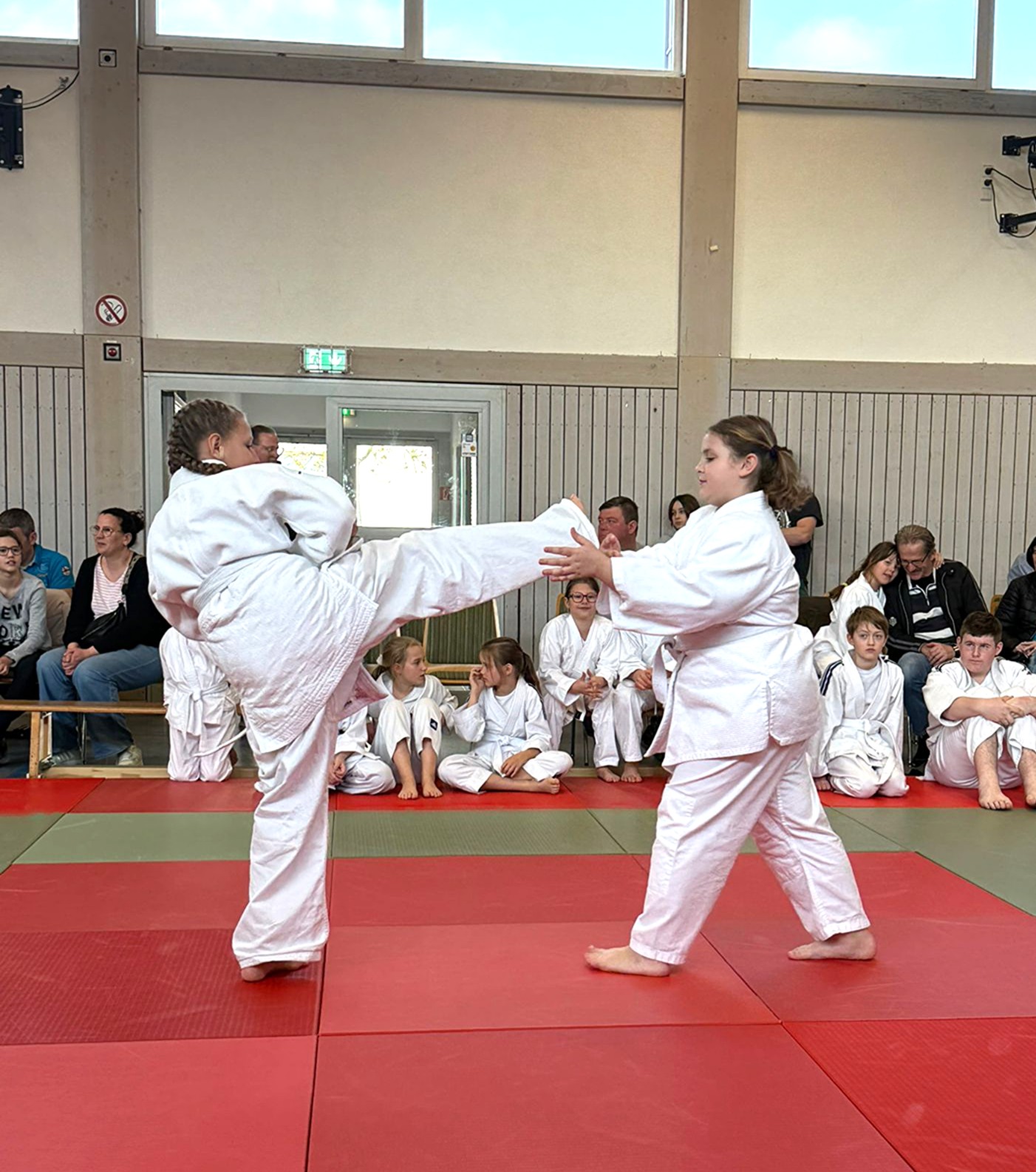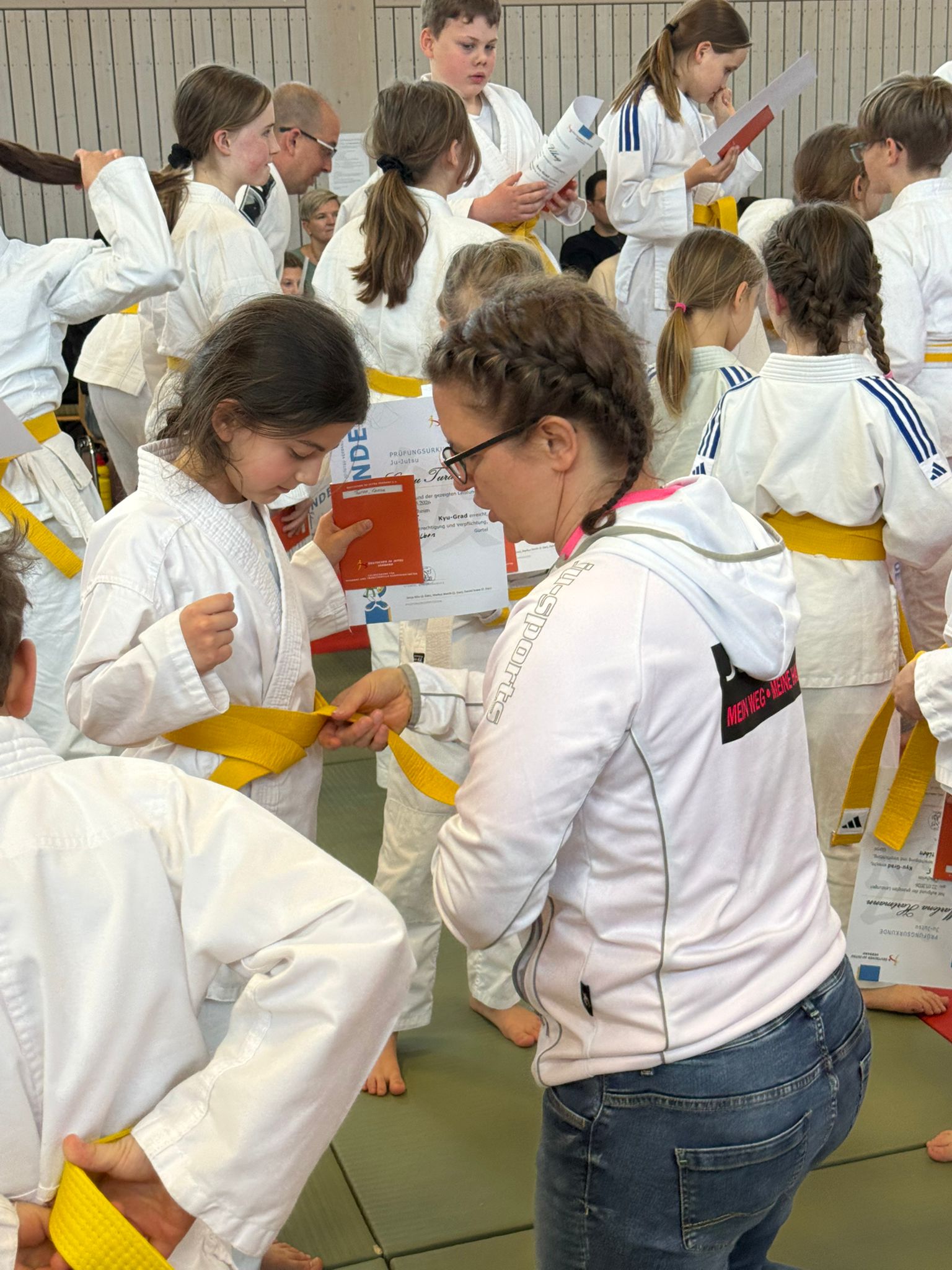 vor Ort und verfolgte die Prüfung. Aufregung, Spannung und gleichzeitig ein spürbarer Zusammenhalt zwischen Kindern, Erwachsenen und dem Trainerteam. Groß und Klein standen gemeinsam auf der Matte, unterstützten sich gegenseitig und wuchsen über sich hinaus.